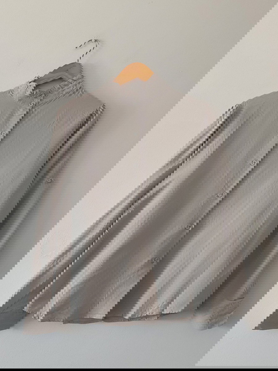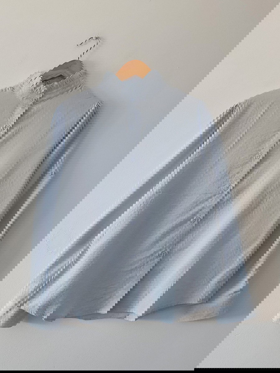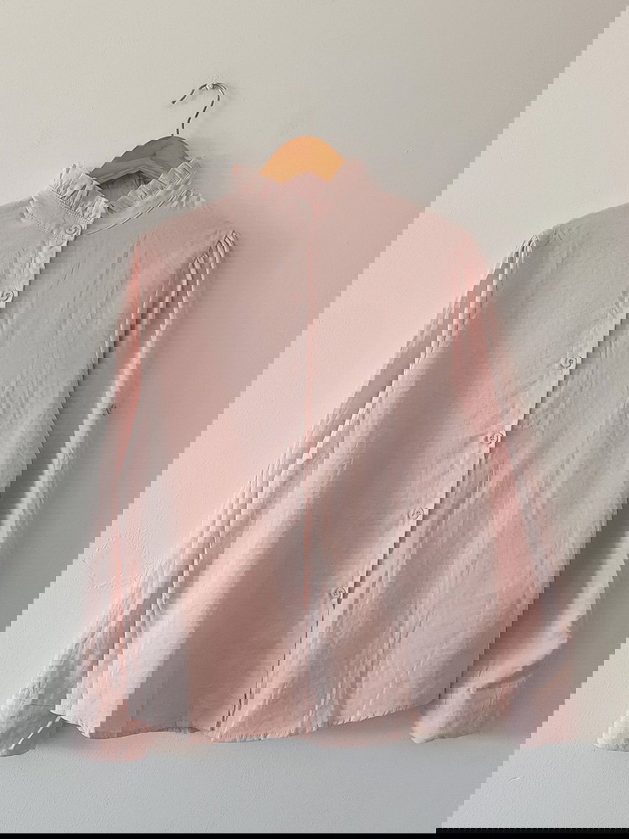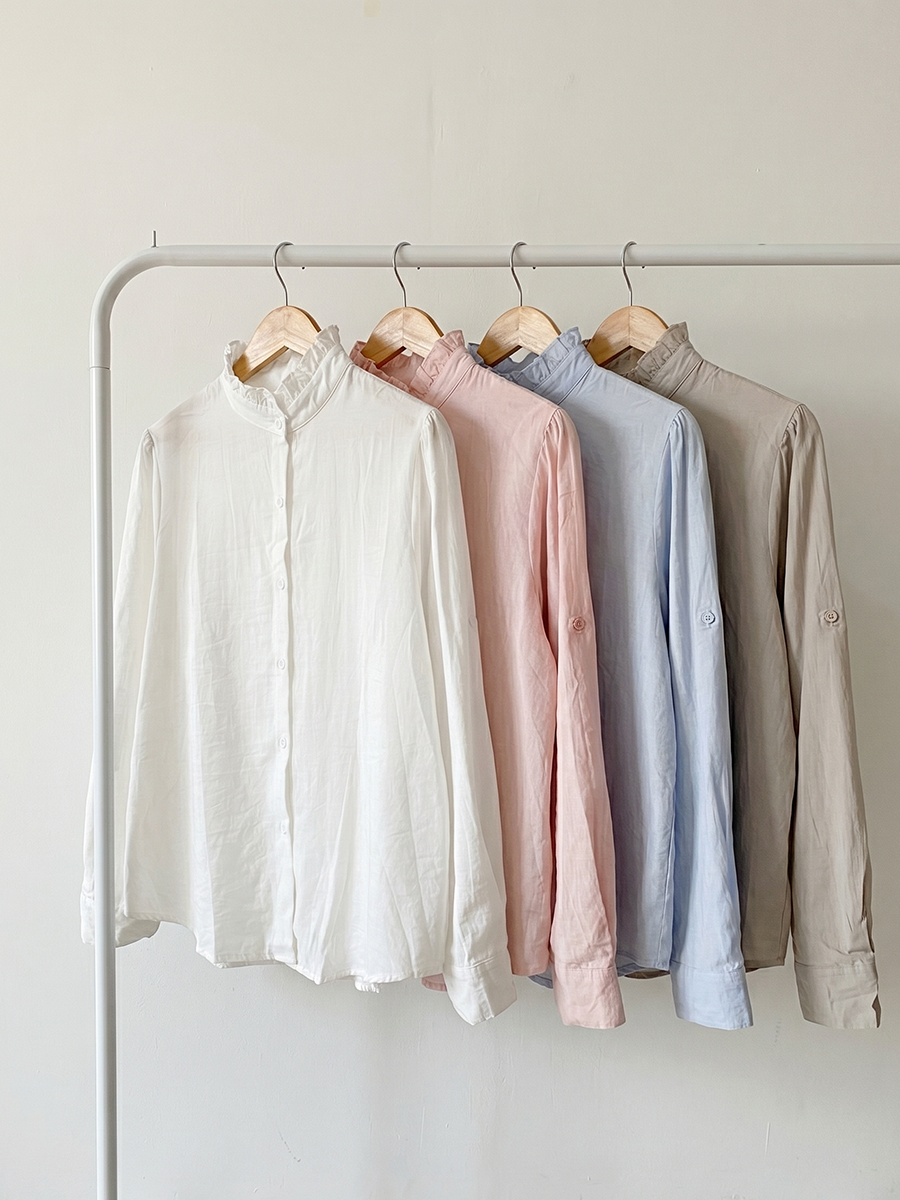 Camisa de manga larga en tela plana. Presenta cuello corto con terminación fruncida. Delantero con abertura central y botones a tono. Silueta recta con leve amplitud. Mangas largas con puños y botón.
