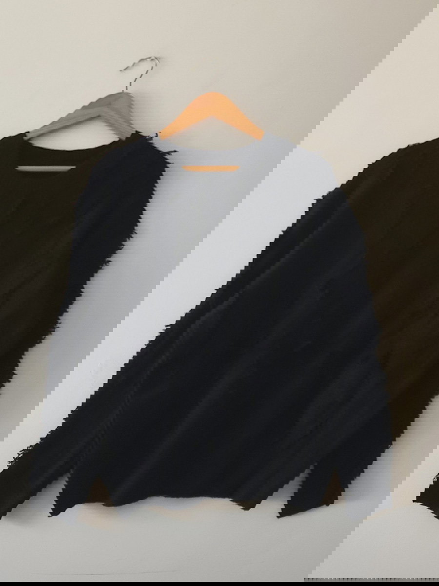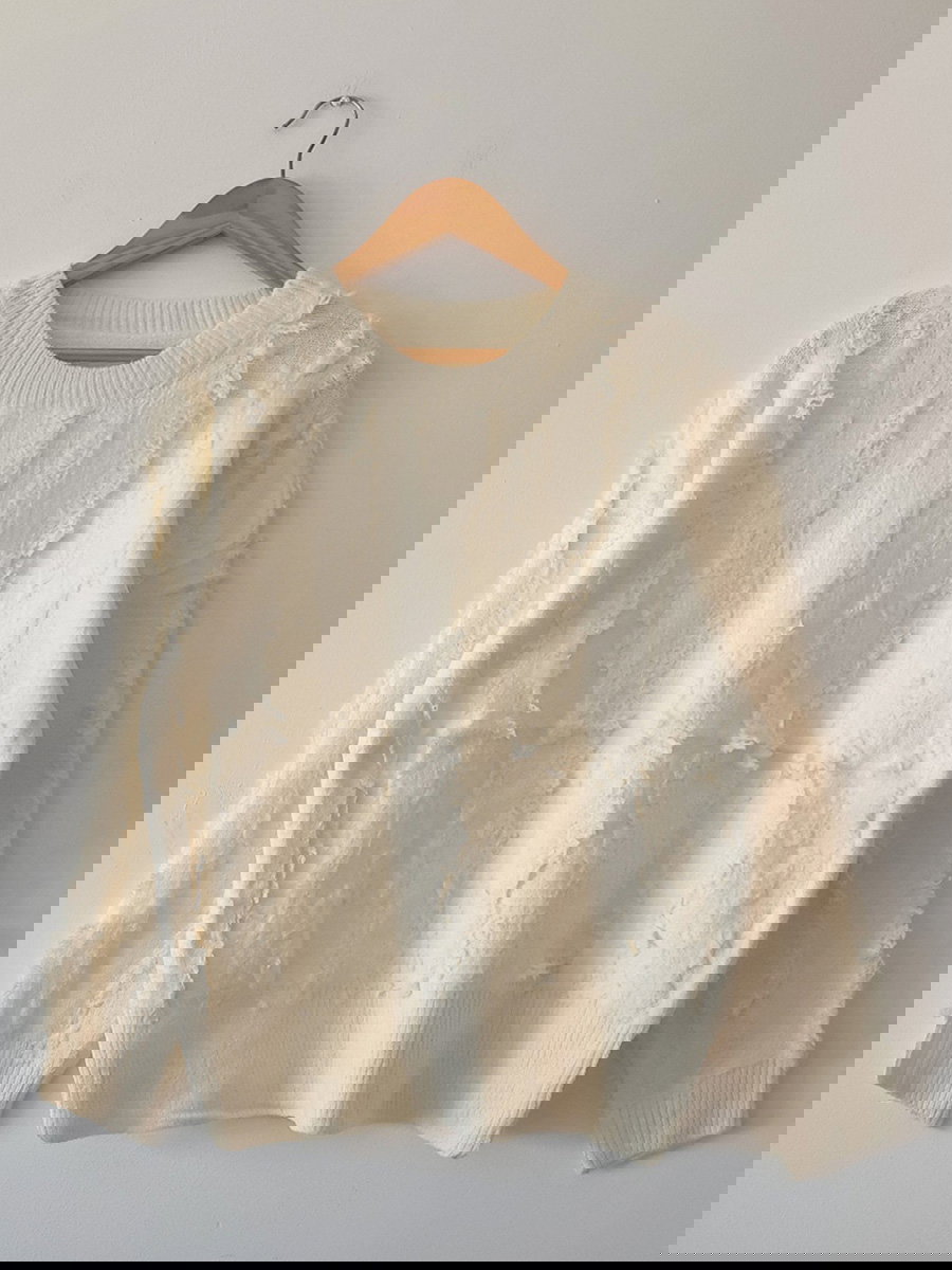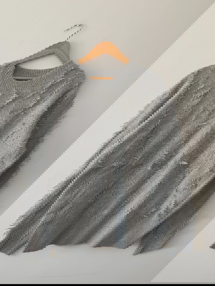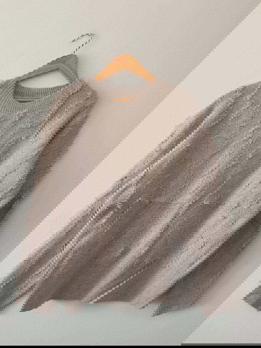 Suéter de tejido con textura irregular en relieve, silueta recta y largo medio. Escote redondo. Mangas largas con puños tejidos.